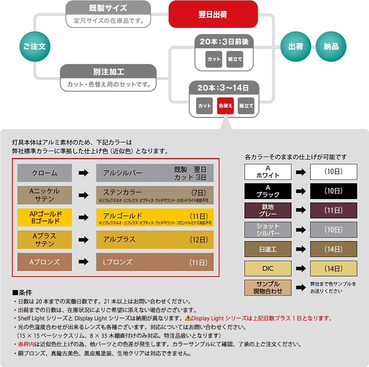 本体サイズの指定が可能、短納期で出荷いたします。 また灯具本体の色替えにもスピーディに対応しお店づくりのタイムロスを軽減します。 自由なサイズ・ご希望に近い仕上げ色に対応することでお店のイメージやカラー、また陳列アイテムの美観を損なわず自由なお店づくりが可能となります。