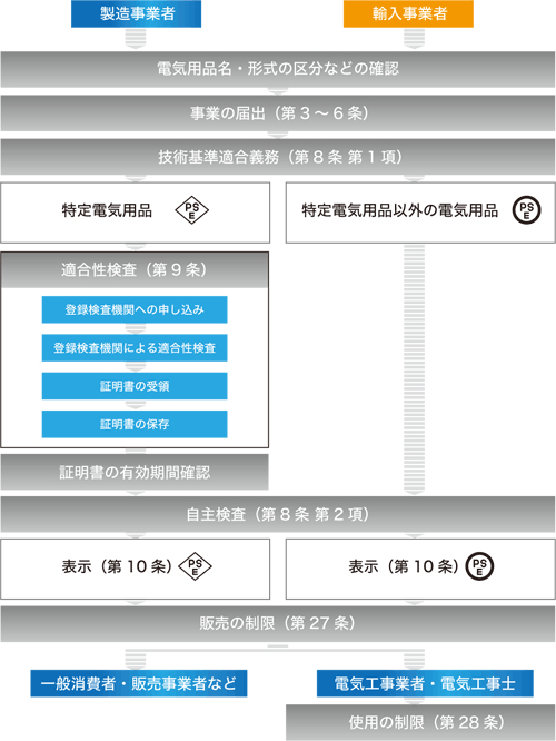 届出事業者は「電気用品」(特定・特定以外共通)を製造・輸入する際、自らの責任で